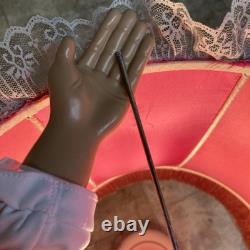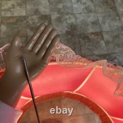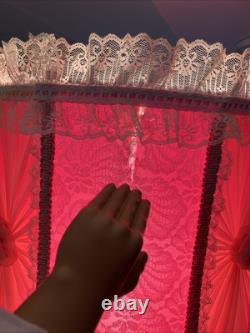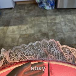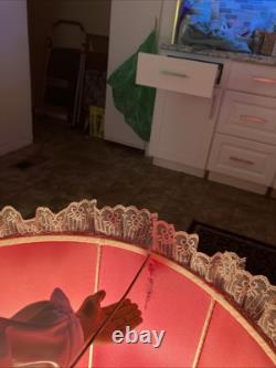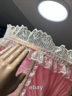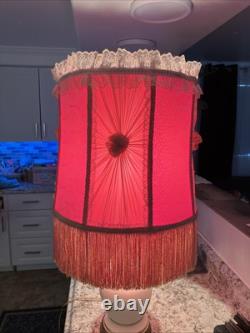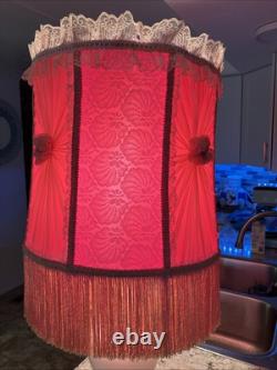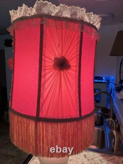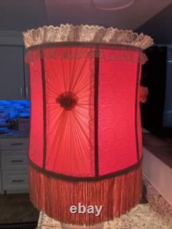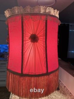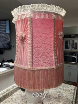 The shade measures 22 inches including the fringes in heighth and 15 in diameter. It features a cylindrical shape and is handmade with a beaded fringe, making it a unique addition to your collection (beautiful when lit) lace and scalloped design. This lamp shade is a perfect fit for those fond of Victorianstyle. The shade is made of high-quality lace and vintage fabric, making it durable and long-lasting.It comes with one lamp shade only and is ideal for collectors and enthusiasts alike. S due to age 2 of the metal pieces on the frame of the lamp, have come unattached, causing damage to the pink fabric as shown in photos, but can be sat back on frame to look attached can be repaired of course. Also, the lace at the top of the lamp has some yellowing glue residue.