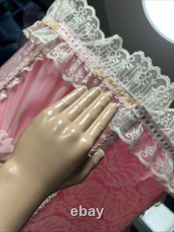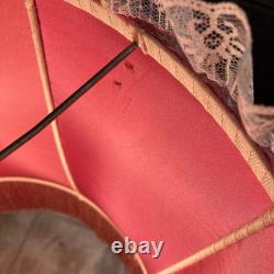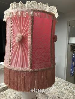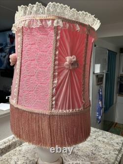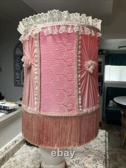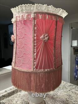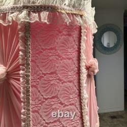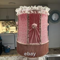 Add a touch of vintage charm to your home decor with this beautiful lamp shade. The bunched and embroidered fabric and pink fringes with cream lace make this shade a perfect fit for Victorian style lovers.