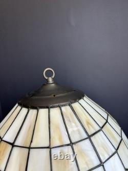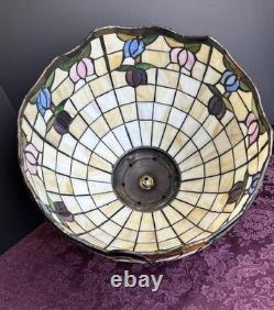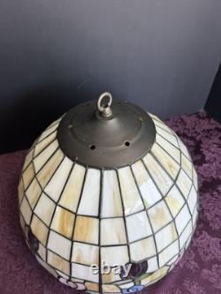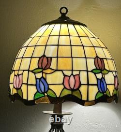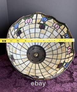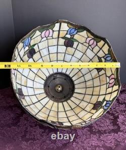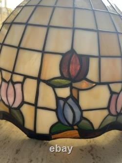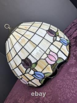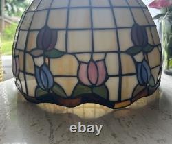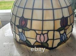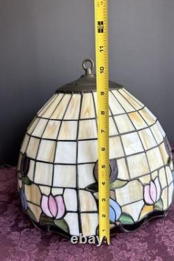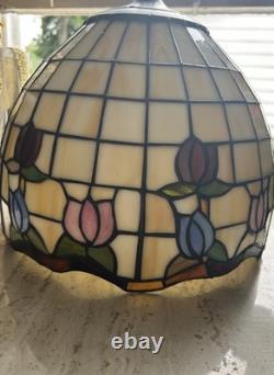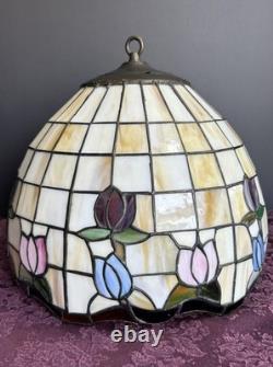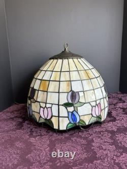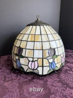 This vintage stained glass lampshade features a beautiful floral pattern of multicolor tulips, adding a touch of retro charm to any room. Made of glass in the Tiffany style, this hanging shade is compatible with a hanging lamp and is designed in a round shape. Perfect for adult's department, this original piece from the 1950s brings a unique barware theme to your space with its glass panel feature. A versatile and stylish addition to any collection of lamps and lighting.