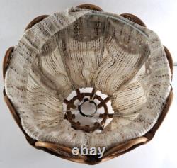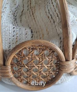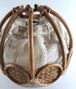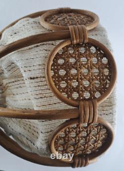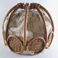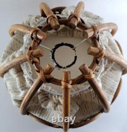 This wicker and fabric lamp shade is in good condition with all of the wicker intact and unbroken. It measures 9" high with a diameter of 12". The diameter at the top is 3.
